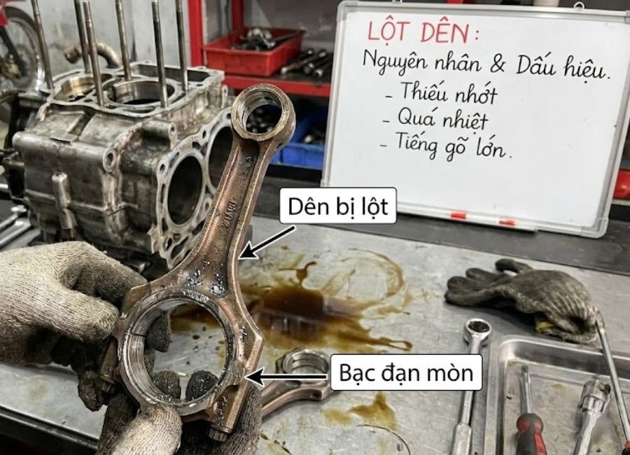 Nhớt kém chất lượng hoặc thiếu nhớt: Đây là nguyên nhân hàng đầu. Không đủ dầu bôi trơn sẽ làm cháy bạc đạn, xước ắc dên và gây lột dên.
